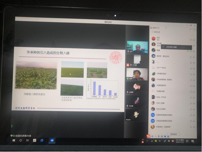 2021年12月2日晚,利用腾讯会议,复旦大学生命科学学院副教授南蓬博士做了题为“生物多样性的研究与保护”的辅导报告。报告由复旦大学杨亚军教授和我院王弋博教授主持,来自全校10余个学院的320多名师生参加了报告会。