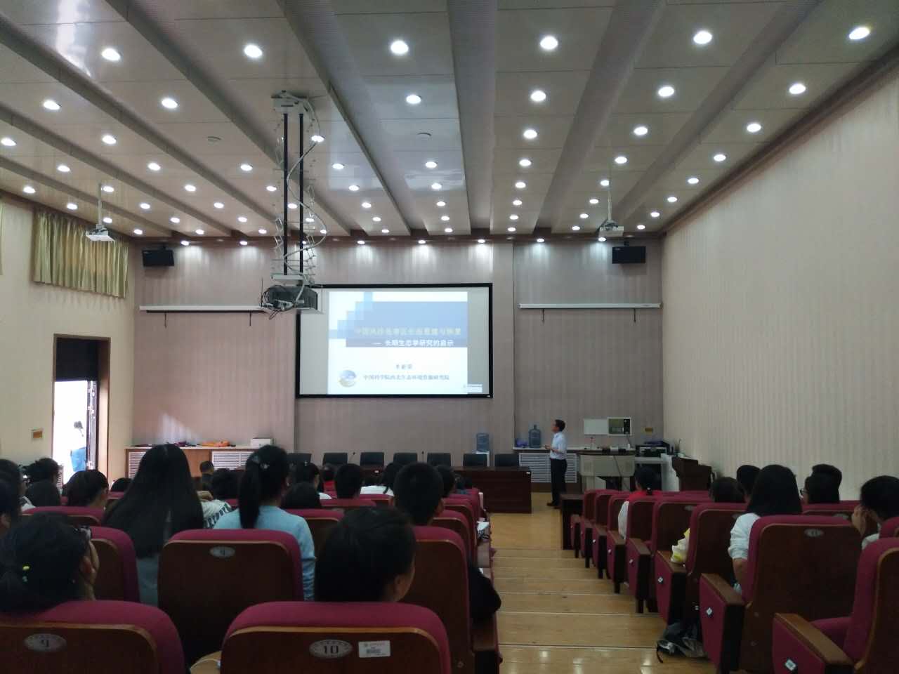6月9日下午,中国科学院西北生态环境资源研究院博士生导师李新荣教授在四号报告厅做了题为“中国风沙危害区生态重建与恢复——长期生态学研究的启示”的学术报告,报告会由365best体育官网入口王廷璞院长主持,部分教师、生物科学、生物技术、食品质量与安全专业本科生及研究生二百余人参加并聆听此次报告。
